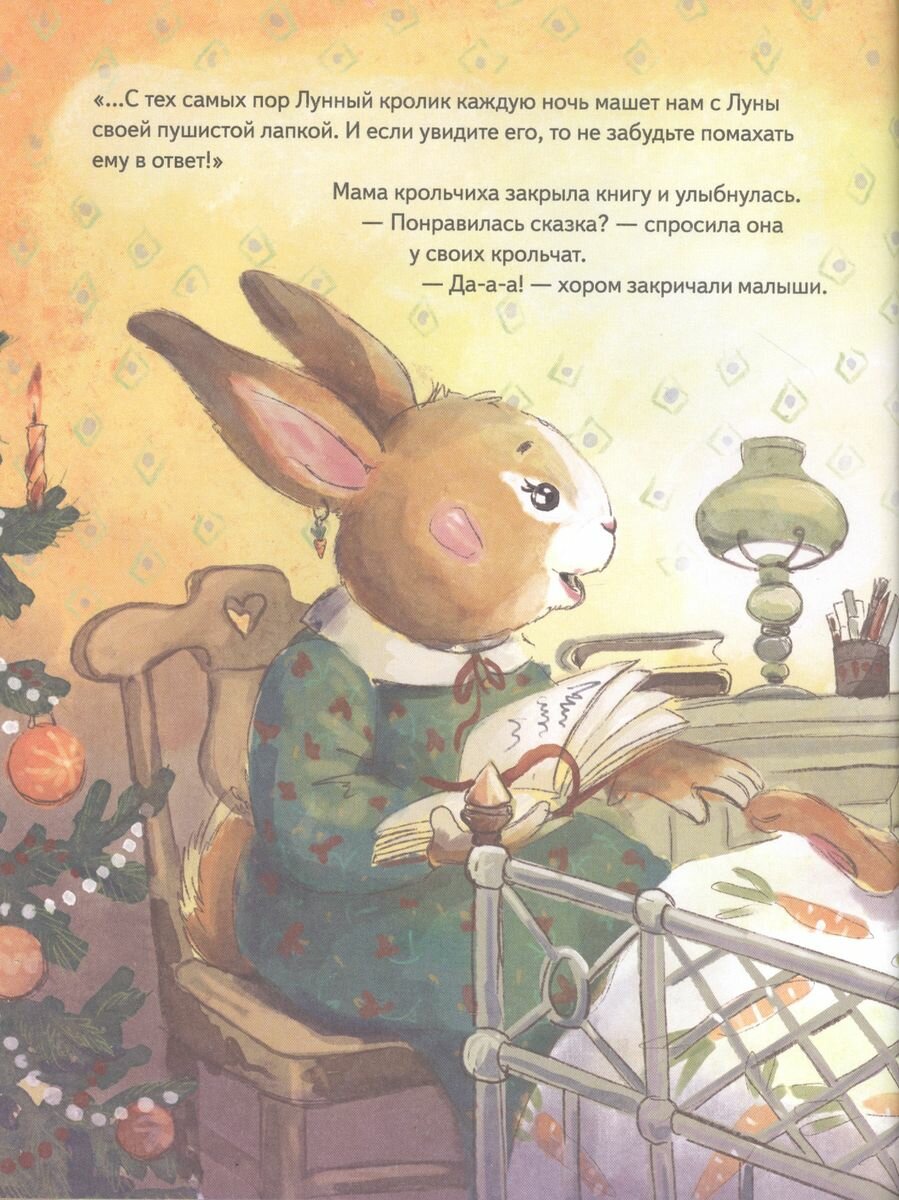 В самую волшебную ночь в году, перед Новым годом, может случиться что угодно! Крольчонок Остер долго не может заснуть и глядит в окно. Интересно, а бывает ли на самом деле то, о чём пишут в сказках? Живёт ли на Луне Лунный кролик? Ой, а вот и он сам! Настоящий и очень задорный! С ним так весело играть и даже… летать вокруг ёлочки. Но у Лунного кролика есть свой маленький секрет. Хотите узнать какой? Тогда скорее открывайте эту книгу, наполненную уютным лунным светом, новогодним волшебством и добротой! В конце книги под QR-кодом вы сможете послушать весёлую песенку Лунного кролика.