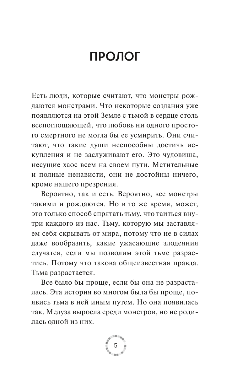 Книга просто замечательная! Я знакома с историей Медузы и совершенно не ожидала, что ретеллинг увлечет меня настолько, что будет прочитан залпом! Автор настолько умело расставляет акценты, что знакомая история задевает за живое и заставляет задуматься о том, что такое человечность, о том, как легко перейти грань между человеком и чудовищем. Очень рекомендую эту книгу!
