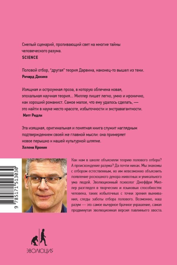 Наш разум позволил нам, единственным из всего живого мира планеты, построить невероятную цивилизацию, подчинить себе силы природы и даже отправиться за пределы Земли. И при этом мы ничтожно мало знаем о том, почему наши предки стали такими умными. Сама история эволюционного развития мозга хранит в себе множество загадок. Почему крылья в процессе эволюции независимо возникли как минимум четырежды, а изощренный разум, столь необходимый для выживания, получил только человек? Почему техническое развитие началось после того, как мозг перестал расти? Зачем, в конце концов, возникли такие странные с точки зрения борьбы за выживание вещи, как юмор, сочинительство, образное мышление и искусство? Джеффри Миллер уверен – ответ на все эти вопросы находится в сфере полового отбора, который оказал и продолжает оказывать на нас куда большее влияние, чем принято думать.