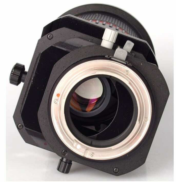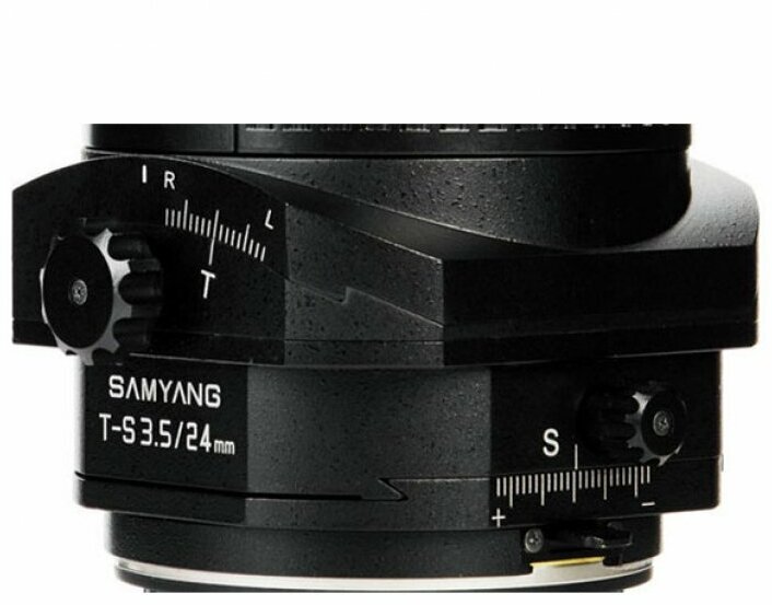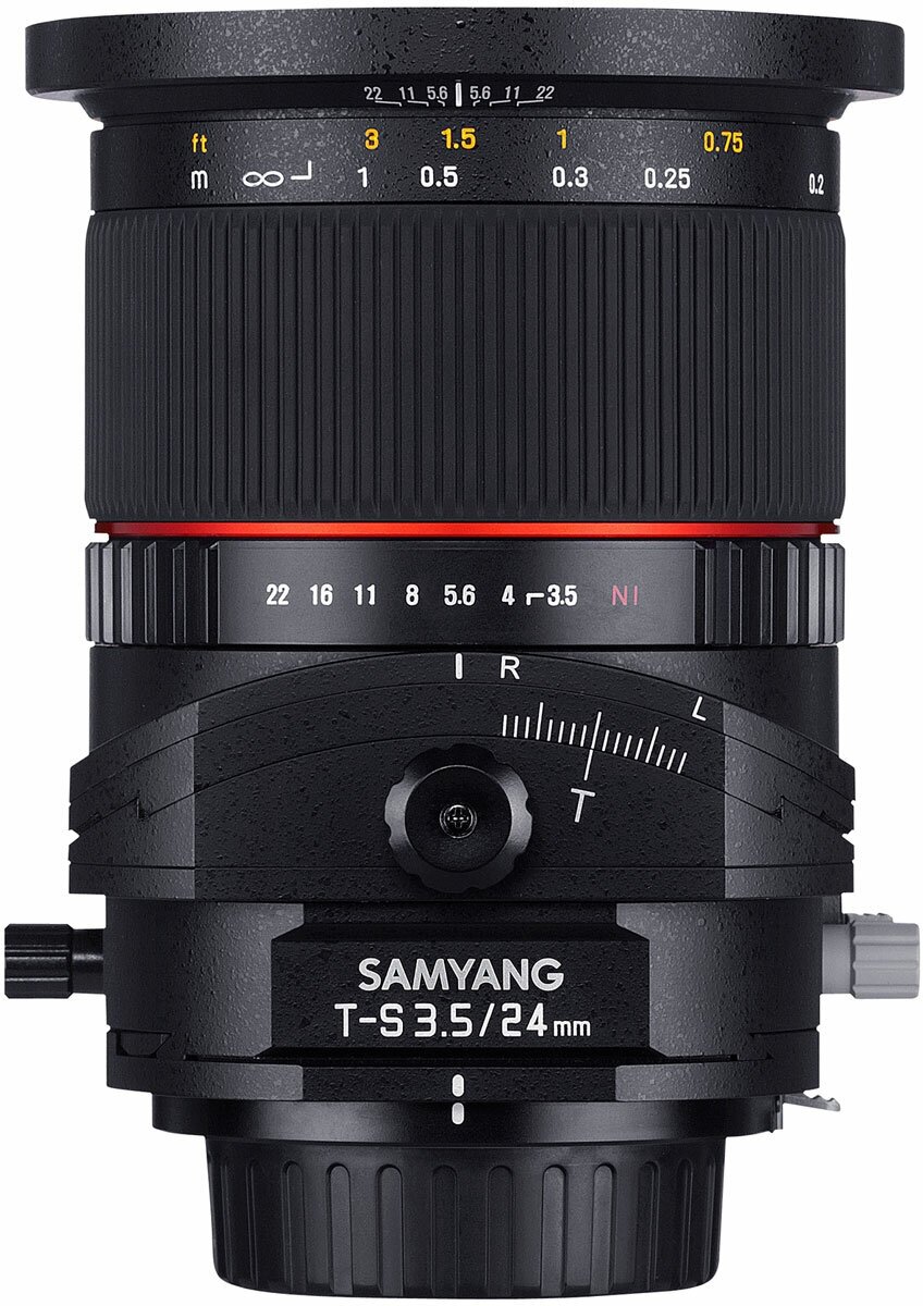 Samyang TS 24mm F3.5 ED AS UMC - полнокадровый широкоугольный объектив с функцией управления перспективой с возможностью наклона плоскости фокусировки и сдвига изображения. Оптическая схема объектива состоит из 16 элементов расположенных в 11 группах, включая два асферических элемента и два элемента иэ ED стекла с очень низким коэффициентом дисперсии. Все элементы имеют многослойное антибликовое покрытие UMC.