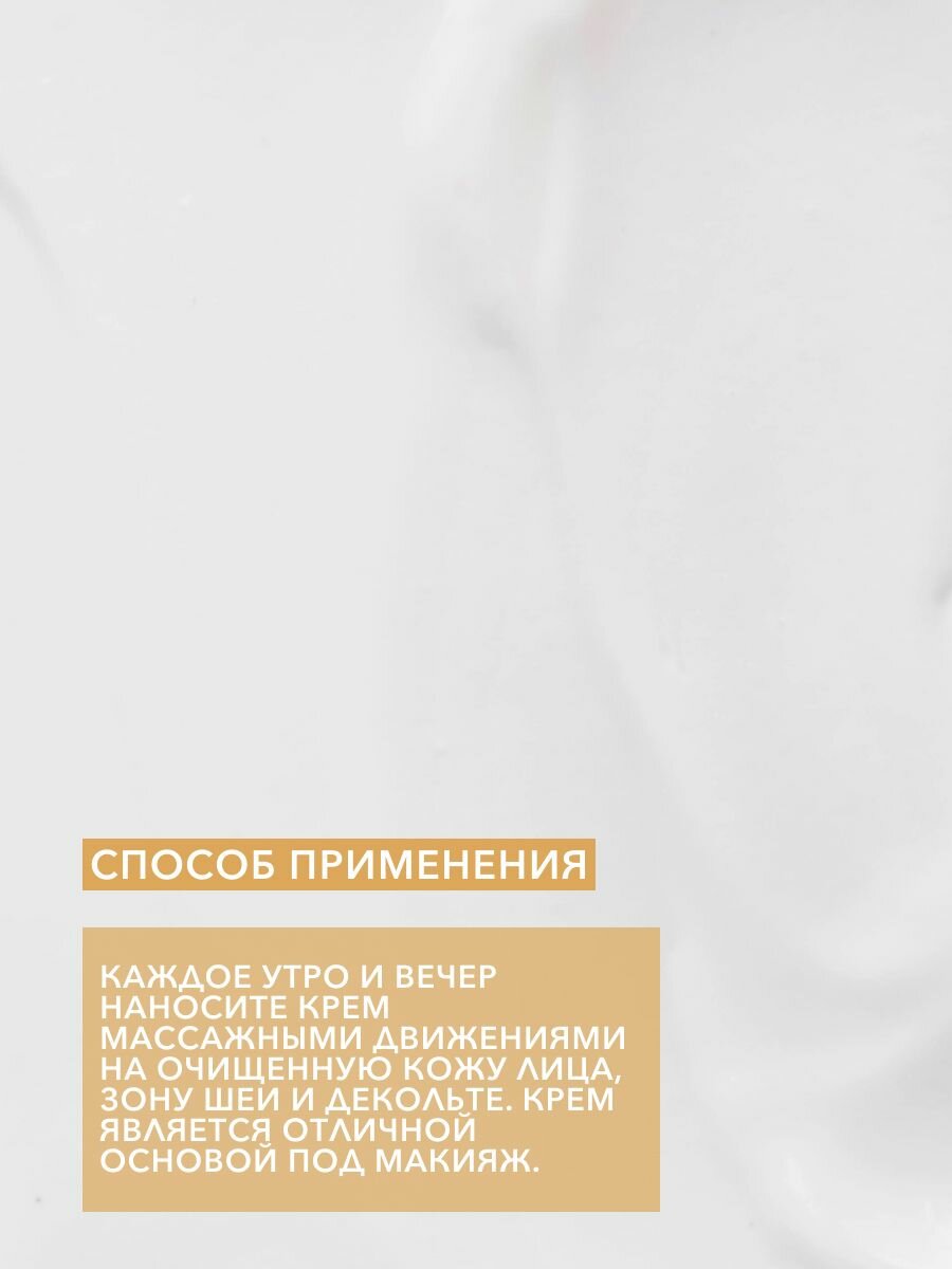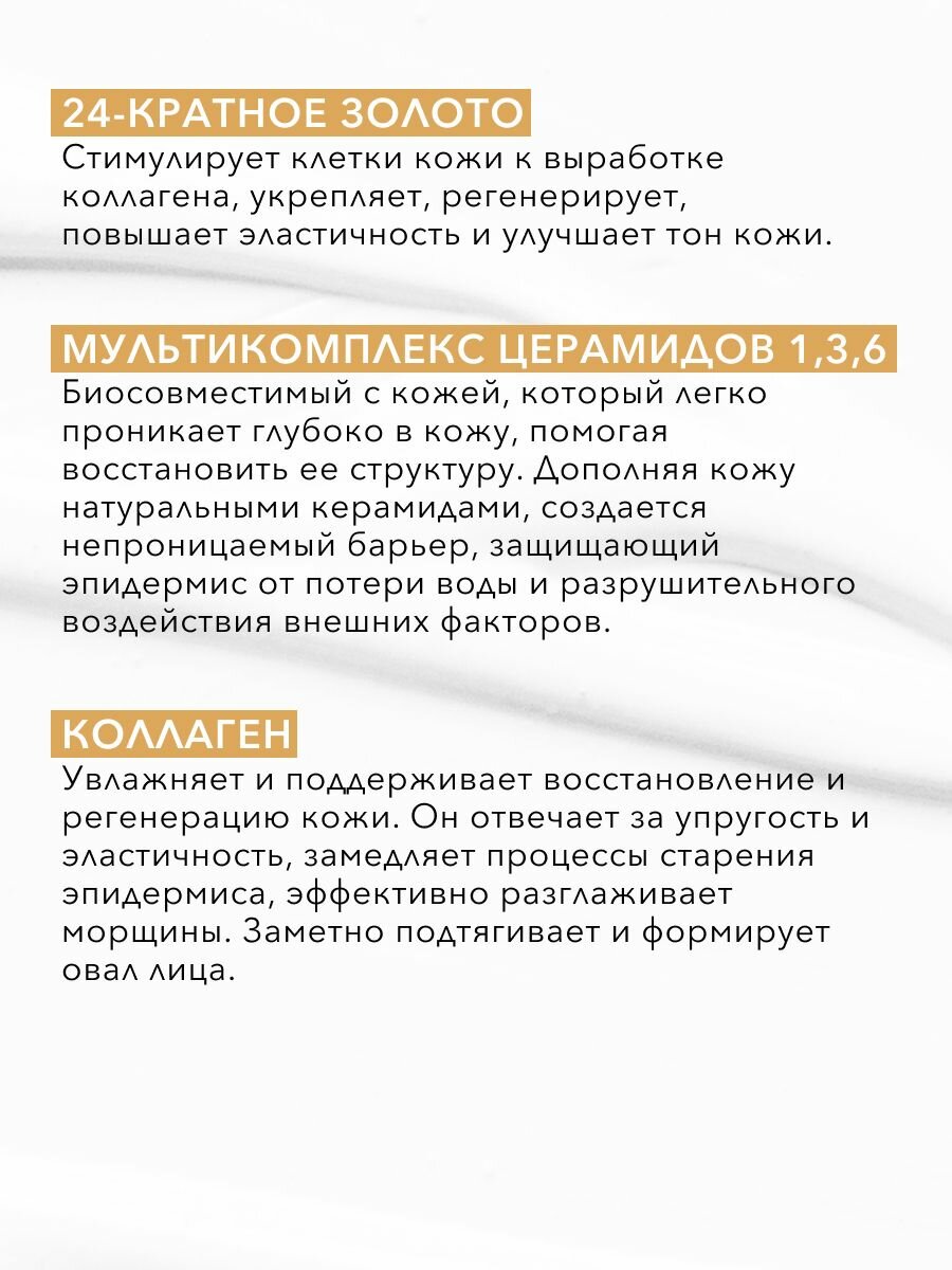 Крем интенсивно увлажняет, разглаживает и укрепляет кожу, на которой появились первые признаки старения. Повышает эластичность кожи и уменьшает морщины. Церамиды 1,3,6, содержащиеся в креме, совместимы с кожей, легко проникают в неё, способствуя восстановлению ее структуры. Крем восстанавливает естественный баланс церамидов в коже, предотвращает сухость кожи, сокращая потерю влаги за счет укрепления защитного барьера. 24 CARAT GOLD стимулирует клетки кожи к выработке коллагена, укрепляет, регенерирует, повышает эластичность и упругость кожи, улучшает тон кожи и придаёт сияние. Мультипептид стимулирует защитные механизмы кожи и способствует процессу ее обновления. Эффективно разглаживает морщинки, питает, повышает упругость, эластичность, придает коже сияние. Способ применения: Каждое утро и вечер наносите крем массирующими движениями на очищенную кожу лица, зону шеи и декольте. Крем является отличной основой под макияж.