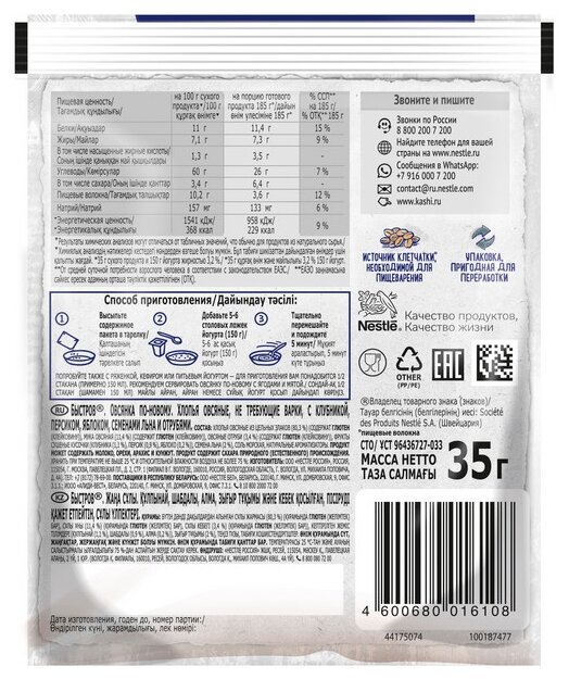 Сведения о составе: С вишней и семенами льна. Состав: Хлопья овсяные из цельных злаков (80,5%) (содержит глютен (клейковину)), мука овсяная (11,4%) (содержит глютен (клейковину)), овсяные отруби (3,4%) (содержит глютен (клейковину)) семена льна (2%), вишня сушеная кусочки (1,9%) (вишня, рисовая мука), соль морская, натуральный ароматизатор. Продукт может содержать молоко, орехи, арахис и кунжут. Продукт содержит сахара природного (естественного) происхождения.