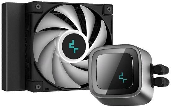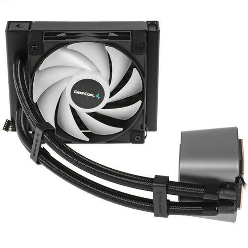 Жидкостный процессорный кулер DeepCool премиум-класса обеспечивает охлаждения и низкий уровень шума благодаря 120-мм радиатору, одному ШИМ-вентилятору FC120 A-RGB и конструкции крышки с бесконечным зеркалом.