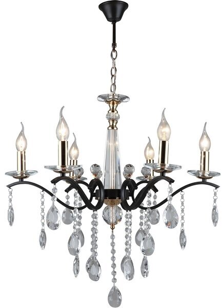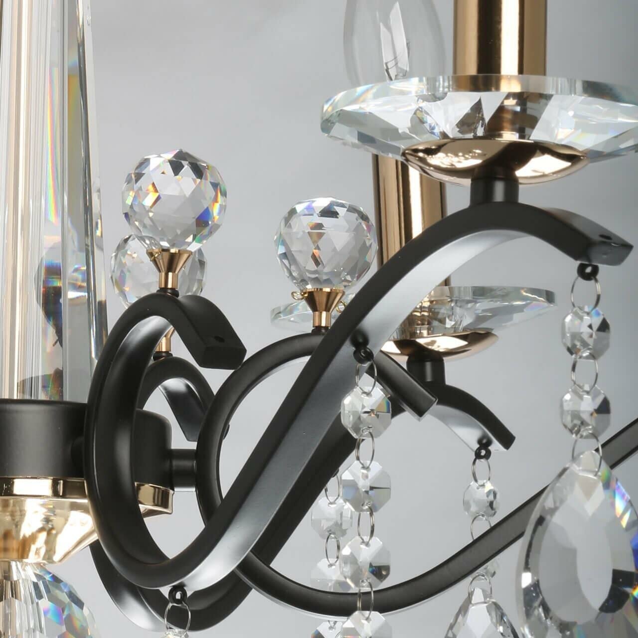 Металлическое основание потолочного светильника окрашено в цвет кофе. Отдельные элементы гальванизированы в цвет золота. Светильник декорирован прозрачным хрусталем.