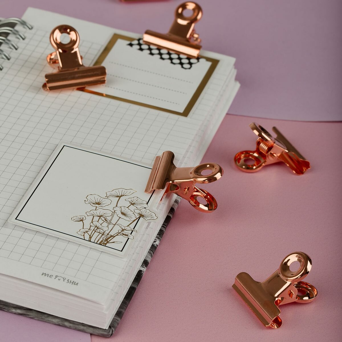 Зажимы-бульдоги для бумаг Meshu Rose Gold 25 мм. позволяют надежно скрепить до 100 листов бумаги.