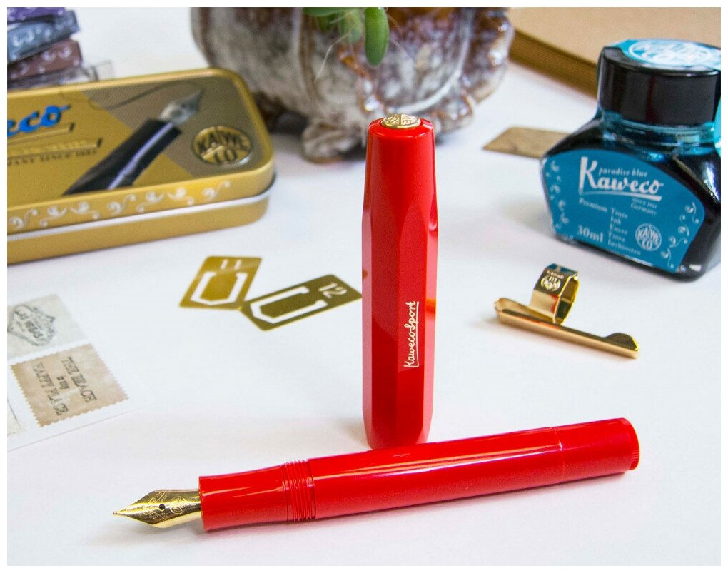 Винтажная перьевая ручка от Kaweco (дизайн серии остался неизменным с 1936 года). Удобный карманный размер. Массивный восьмигранный колпачок на резьбе. Позолоченное стальное перо (23Кт) с иридиевым наконечником. Длина ручки в закрытом состоянии - 10.5 см. Корпус из прочного ABS-пластика и поликарбоната. К ручке подходят сменные картриджи Kaweco стандарта International (short) и съемный клип к восьмигранным ручкам Kaweco (продается отдельно). Синий картридж в комплекте.