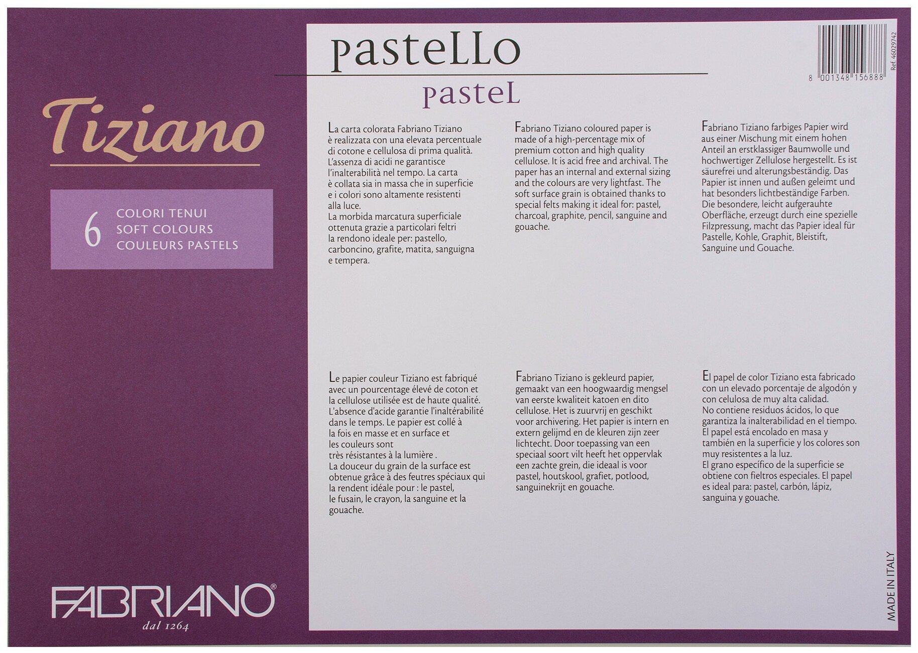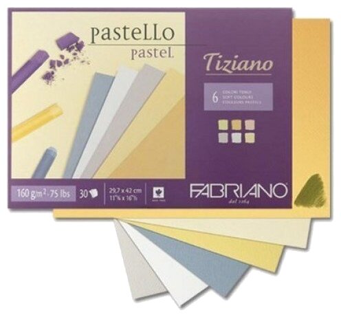 О товаре: Склейки Tiziano Soft Colorous выпускаются в различных форматах. В каждом блокноте-склейке представлена бумага мягких оттенков, 6 цветов. Всего 30 листов, плотностью 160 г/кв.м Бумага для пастели Tiziano изготавливается из целлюлозы и хлопка (40%) без добавления кислот, что придаёт ей высокую светостойкость. Сцепление материалов для живописи с поверхностью бумаги обеспечивается за счёт её зернистой (шероховатой) фактуры. Бумага Tiziano может использоваться для любых графических материалов, например, для угля, сангины и сепии, а также для всех видов печати.