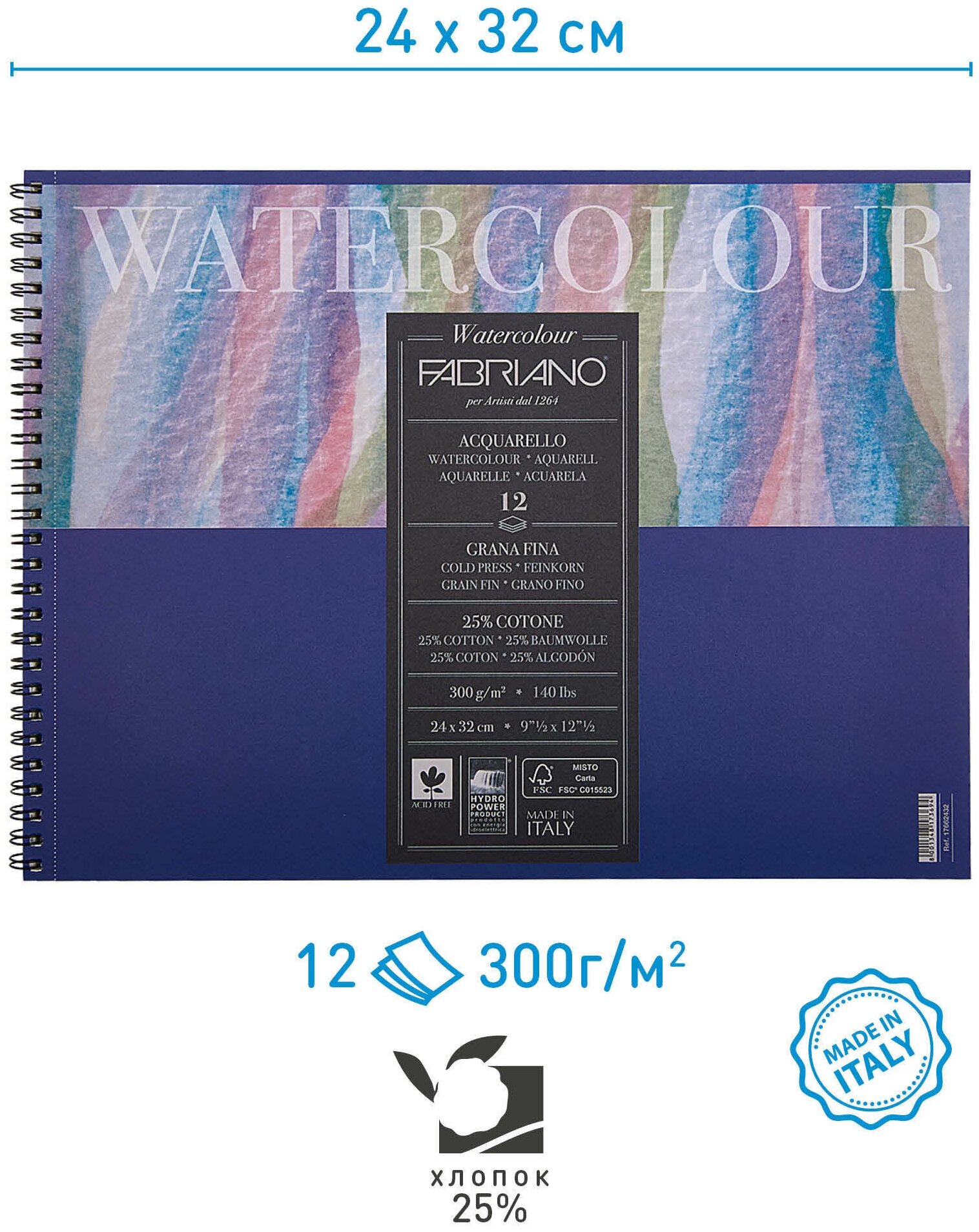 Альбом для акварели на спирали Fabriano "Watercolour" 24x32 см 12 л 300 г (17662432) (размер: 240x320)