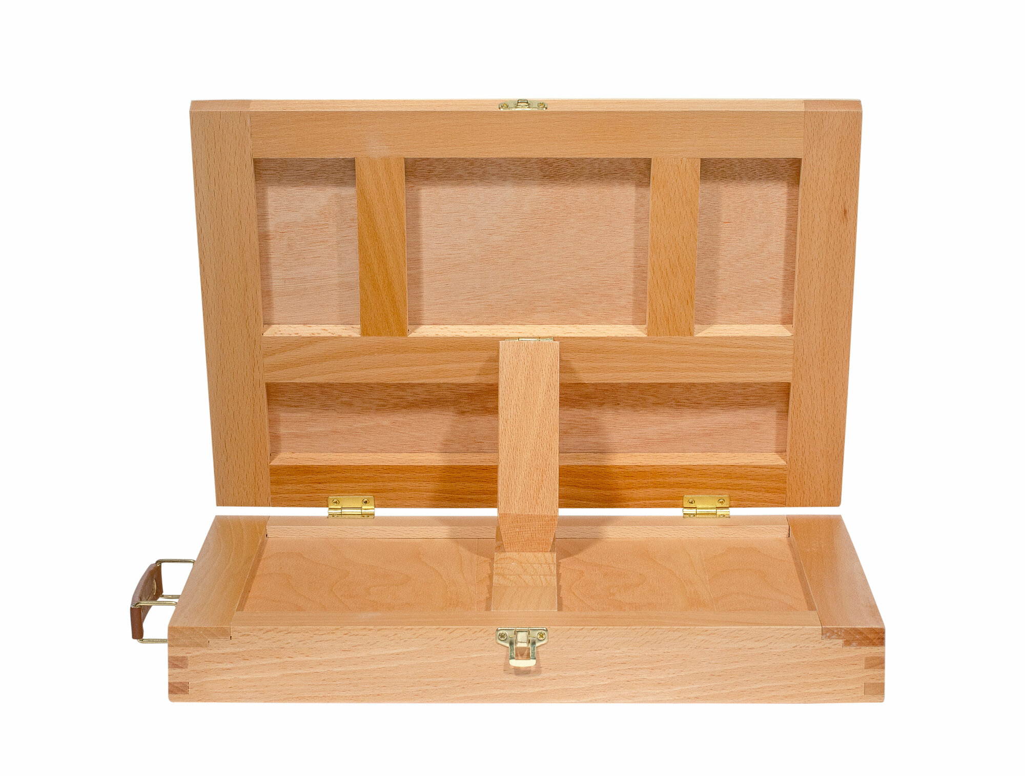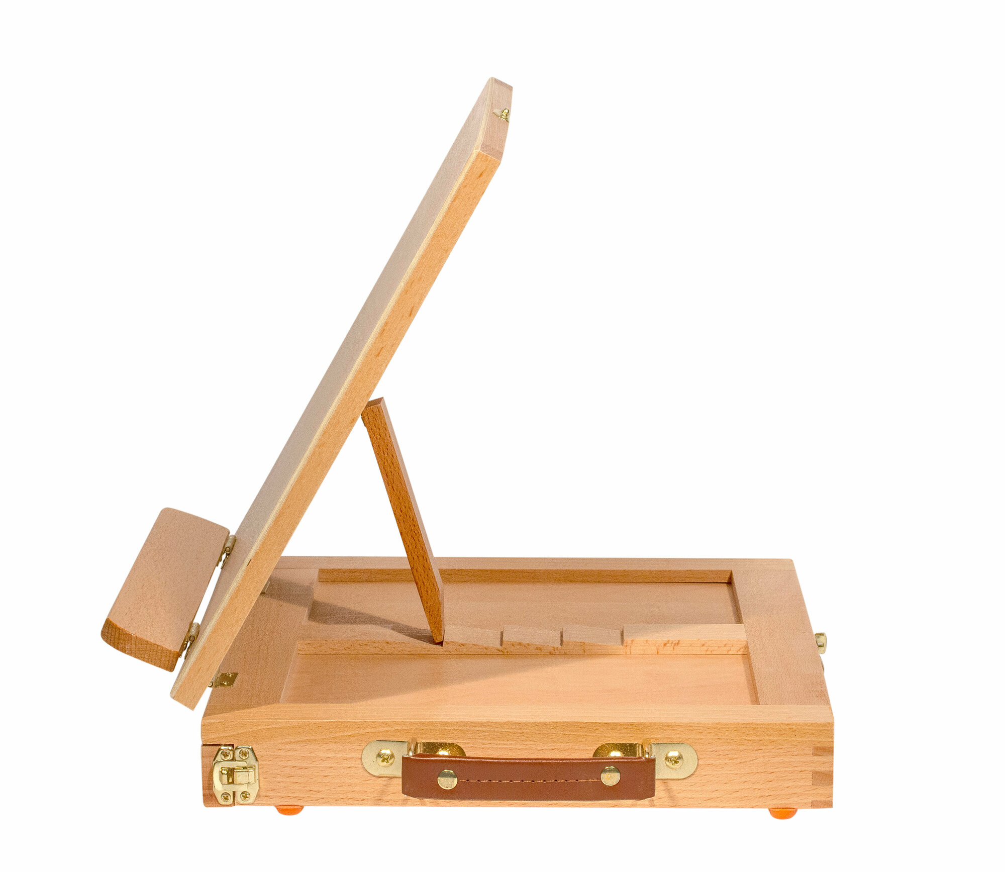 Настольный мольберт-этюдник из бука TE-01A представляет собой модернизацию модели TE-01A — вместо каркасного держателя холста в этой модели применили планшет размером 25*33см - мольберт вмещает лист формата А4 альбомной ориентации, что делает его поистине универсальным, его можно использовать и с холстами, и с бумажными основами для живописи. Планшет регулируется по наклону. Встроенный ящик для хранения художественных принадлежностей и палитры (поставляется в комплекте с мольбертом). Удобная ручка для переноски позволяет взять его на пленэр и использовать как компактный этюдник. Резиновые подпятники противостоят скольжению по поверхности стола. Планшет имеет 4 фиксированных положения регулировки по наклону. При использовании с холстом на подрамнике рекомендуемый высота холста в пределах 30см.