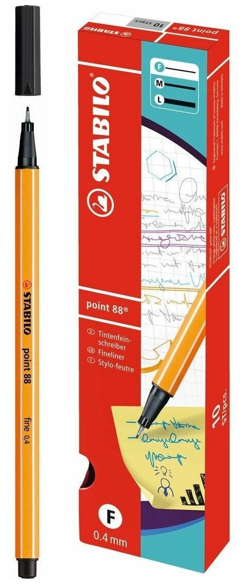 STABILO point 88 - идеальный компаньон для школьников, студентов и профессионалов. Впервые появившись на рынке в 1977 году, она ценится во всем мире за свое качество и удобство использования. В Европе это самая популярная капиллярная ручка. Знаменитая шестигранная форма корпуса STABILO point 88 очень удобна для руки. Выбор из 47 цветов означает, что вы всегда найдете идеальный оттенок для своих нужд, а 6 неоновых цветов только усилят эффект. Благодаря тому, что ручка длительное время не высыхает без колпачка, вам не придется беспокоиться, если вы случайно отвлечетесь и не закроете ее. Толщина линии 0,4 мм.