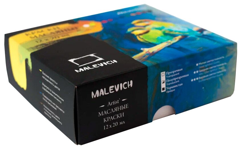 Масляные краски от бренда "Малевичъ" изготовлены по выверенной формуле с высоким содержанием пигмента, что обеспечивает высокую яркость и насыщенность цветов, устойчивость к свету и неизменность цвета в течении длительного времени. Краски обладают оптимальной плотностью и консистенцией, что гарантирует лёгкость и пластичность мазков и исключает возможность появления трещин после высыхания. В наборе 12 цветов в тубах по 20 мл.