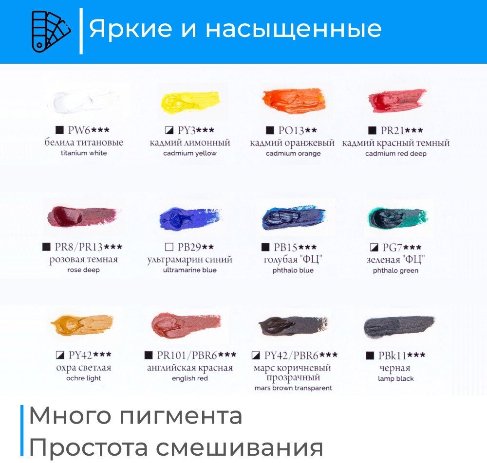 | Состав набора | белила титановые, кадмий лимонный, кадмий оранжевый, кадмий красный темный, розовая темная, ультрамарин синий, голубая "ФЦ", зеленая "ФЦ", охра светлая, английская красная, марс коричневый прозрачный, черная |