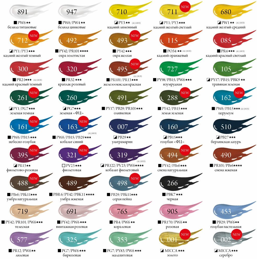 Все цвета имеют 7 баллов по шкале светостойкости из 8 возможных. Это значит, что находясь в помещении, картина не изменит своего первоначального тона более 100 лет. Краски имеют яркие насыщенные цвета, которые удовлетворят как сторонников классической живописи, так и любителей авангарда, а использование разбавителя позволит добиться эффекта акварели в масляной живописи и легко делать лессировки. Эти краски прекрасно подойдут как для работы кистью, так и мастихином в пастозной технике.