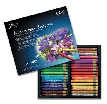 О серии: акварельные мелки Gallery производятся из лучших материалов. Представляют собой утолщённый карандаш без деревянного корпуса. Палитра серии гармонично подобрана. Могут быть использованы на сухой или мокрой бумаге. Хорошо размываются водой. Выпускаются в наборах.