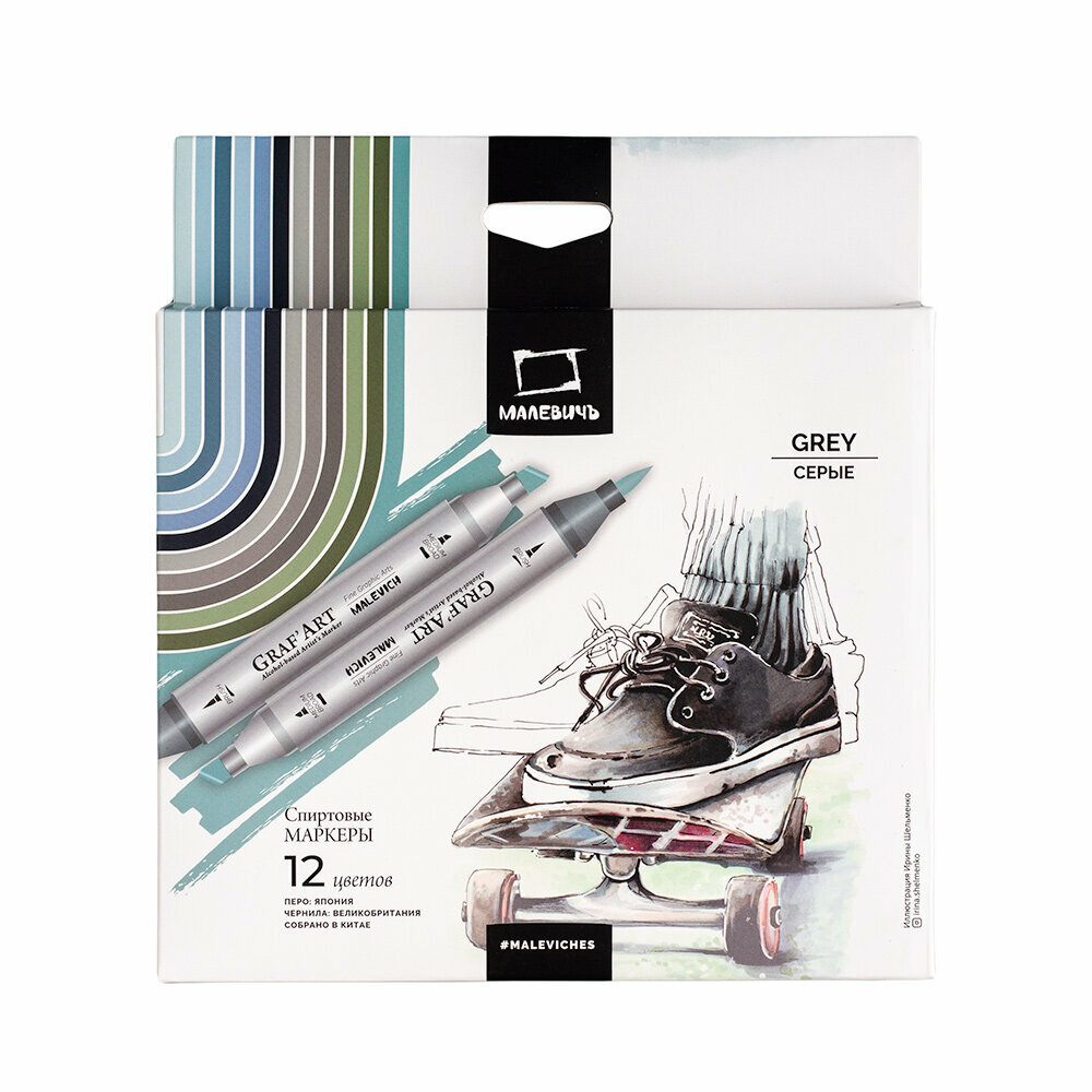 Набор маркеров спиртовых Малевичъ "GrafArt Brush" Серые 12 цветов (МЛ-190910)