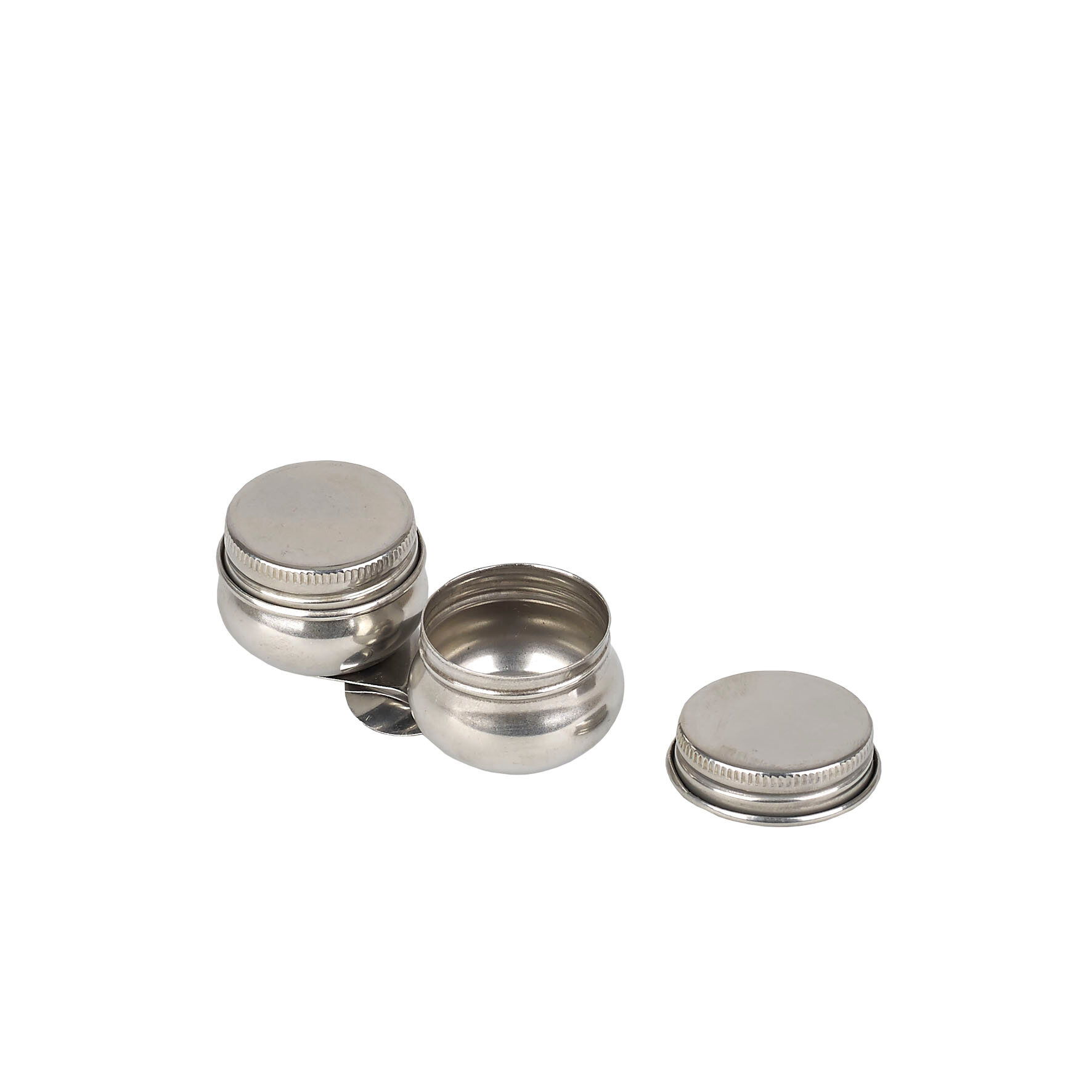 Двойная масленка имеет крепление на палитру и предназначена для хранения разбавителя для масляных красок. Покрыта антикоррозийным составом, который предохраняет ее от воздействия растворителя. Две емкости позволяют использовать несколько разбавителей, комбинации разбавителя, льняного масла или лака.