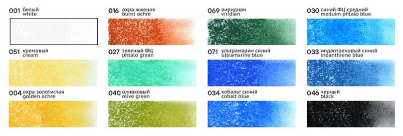 Цвета в наборе подобраны для создания морских пейзажей: разнообразие синих и зеленых оттенков.