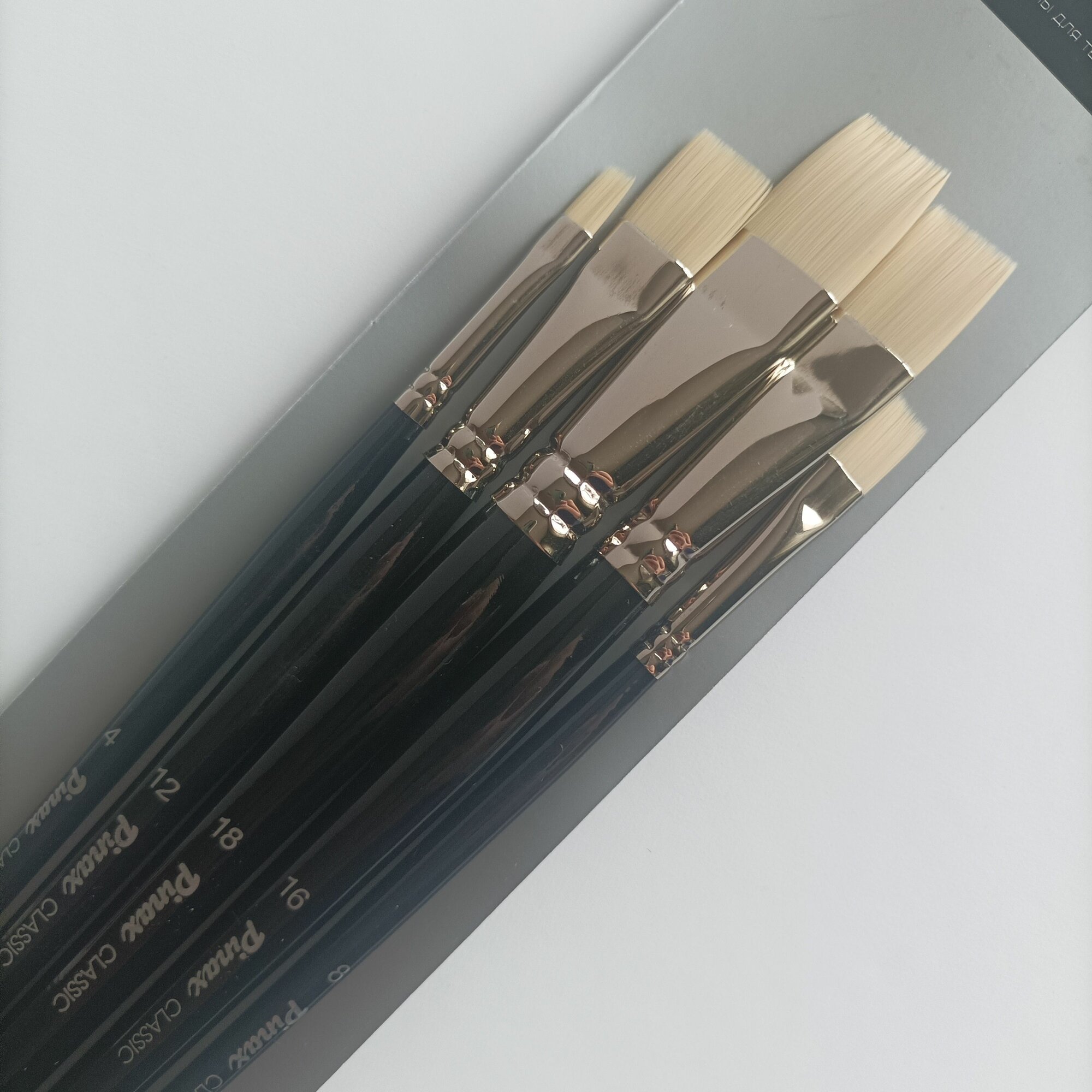 Характеристика: для производства кистей этой серии использована белая синтетика, которая по свои свойствам, аналогична натуральной щетине. Каждый волосок заострен к кончику и имеет продольное расщепление. Такой ворс жесткий и упругий. Такой ворс позволяет долго работать с химическими растворителями. Пучок кисти сформирован из синтетических волосинок разного диаметра. Он имеет плоскую форму. Кисти выполнены на деревянной ручке, которая покрыта тремя слоями рояльного лака.