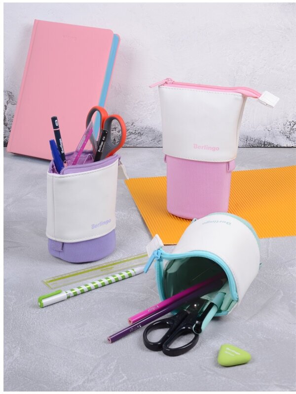 Основание пенала имеет устойчивую круглую форму и выполнено из вельвета, верхняя "подвижная" часть сделана из полиуретана и может быть зафиксирована как в поднятом, так и в опущенном состоянии, позволяя использовать пенал в качестве органайзера. Внутри 3 тканевых кармашка для хранения канцтоваров. Поставляется без наполнения.