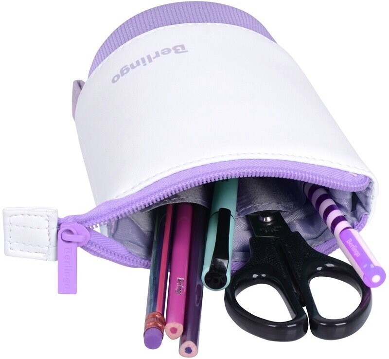 Основание пенала имеет устойчивую круглую форму и выполнено из вельвета, верхняя "подвижная" часть сделана из полиуретана и может быть зафиксирована как в поднятом, так и в опущенном состоянии, позволяя использовать пенал в качестве органайзера. Внутри 3 тканевых кармашка для хранения канцтоваров. Поставляется без наполнения.