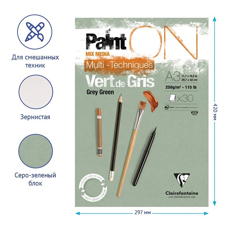 Альбом для смешанных техник Paint'ON – лучшая линейка от французского производителя Clairefontaine. Качество и плотность 250 г/м2 делают бумагу устойчивой к царапинам, позволяют наносить материал в несколько слоев. Серо-зеленый оттенок и легкое зерно придают контрастность и глубину рисунку. Легкое зерно позволяет использовать разные инструменты для работы. Подходит для работы карандашом, углем, пастелью, фломастерами, маркерами, тушью и гуашью. Вид крепления – склейка, позволяет легко отделить лист с готовым рисунком.