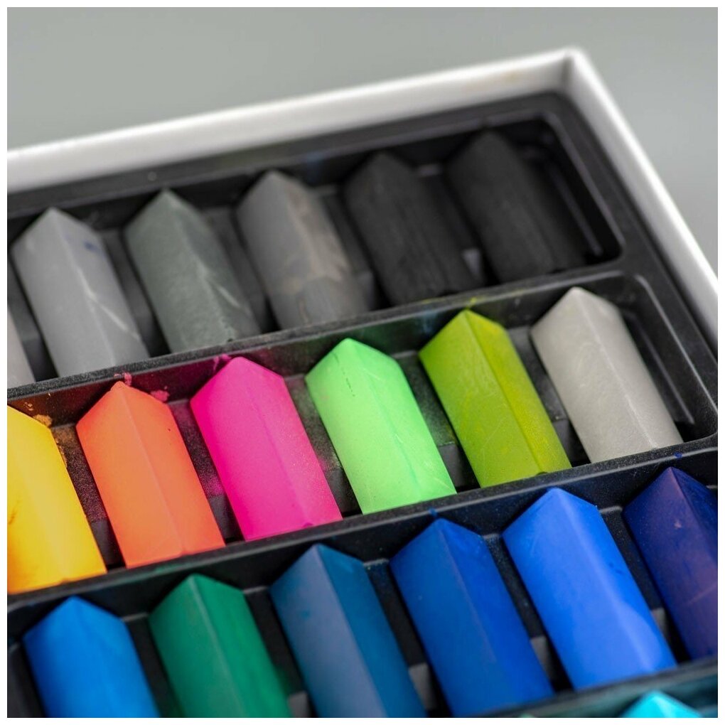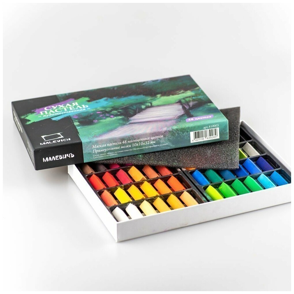 Сухая пастель бренда Малевичъ произведена с использованием оптимального количества пигмента и связующего вещества, что обеспечивает яркий насыщенный цвет и отличные показатели светостойкости. Пастель обладает средней мягкостью, цвета отлично смешиваются между собой, позволяя создавать плавные переходы и новые цветовые сочетания. В наборе 48 цветов квадратных 1/5 мелков.