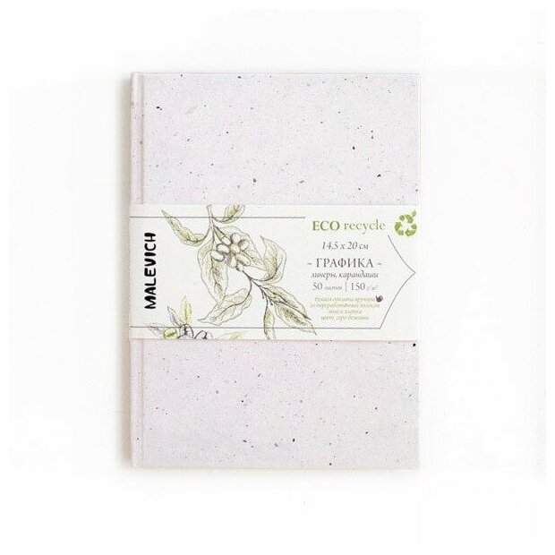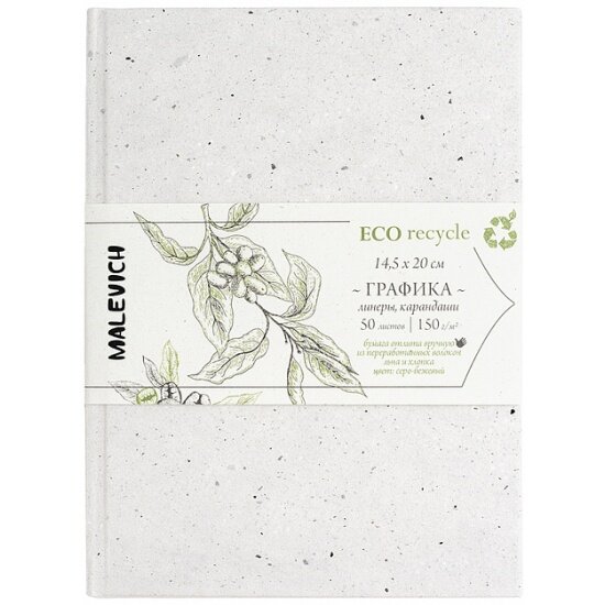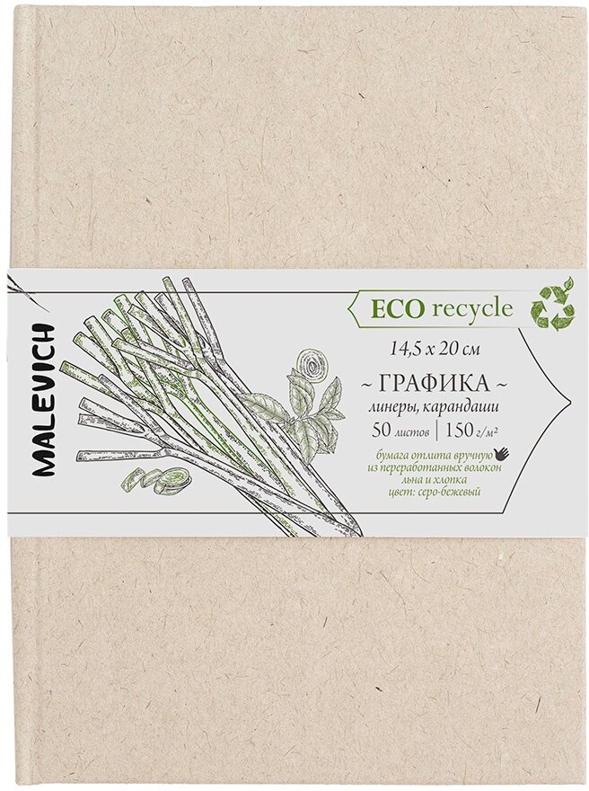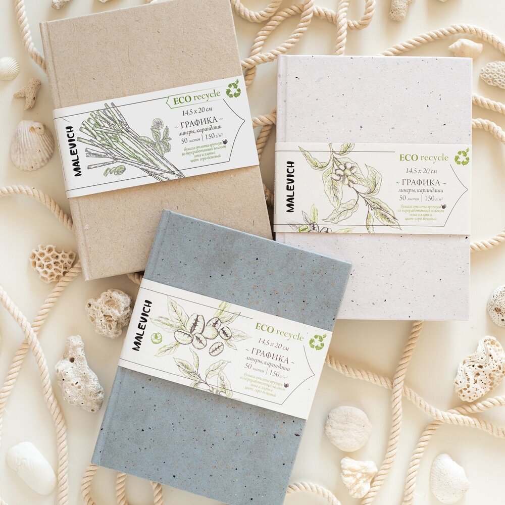 Скетчбуки серии "GrafArt ECO" от бренда "Малевичъ" содержат отлитую вручную бумагу из переработанных хлопковых и льняных волокон. Бумага обладает шероховатой поверхностью и бежевато-серым цветом, плотность бумаги 150 гр/м2 обеспечивает возможность работы различными графическими материалами — линеры, карандаши, пастель, уголь, сангина и т.д. Обложка скетчбука содержит волокна кофе, амбалажная лента сделана из вторично переработанной бумаги.