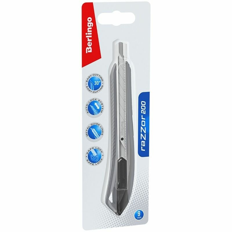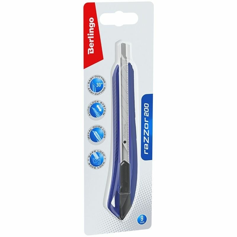 Нож канцелярский с системой автоматической фиксации лезвия auto-lock. Корпус ножа выполнен из высококачественного ABS пластика. Имеет металлические направляющие. Комплектуется износостойким лезвием из стали SK5 с углом 30°. Ширина лезвия - 9 мм.