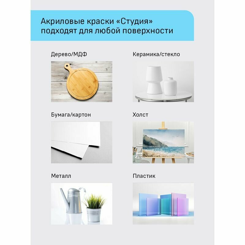 Набор новых акриловых красок серии «Студия» предназначен для художественно-живописных и декоративно-прикладных работ. Главные отличия: насыщенные цвета, высокая адгезия, прочность красочного слоя. После высыхания краски становятся глянцевыми, практически не темнеют, специальная добавка позволяет максимально раскрыть красоту цветов. Художественный акрил прекрасно разносится, подходит для бумаги, картона, грунтованного холста, дерева, стекла, кожи, ткани. Время высыхания: от 10 минут до 1 часа в зависимости от толщины слоя. В упаковке 12 цветов. Объём тубы — 9 мл.