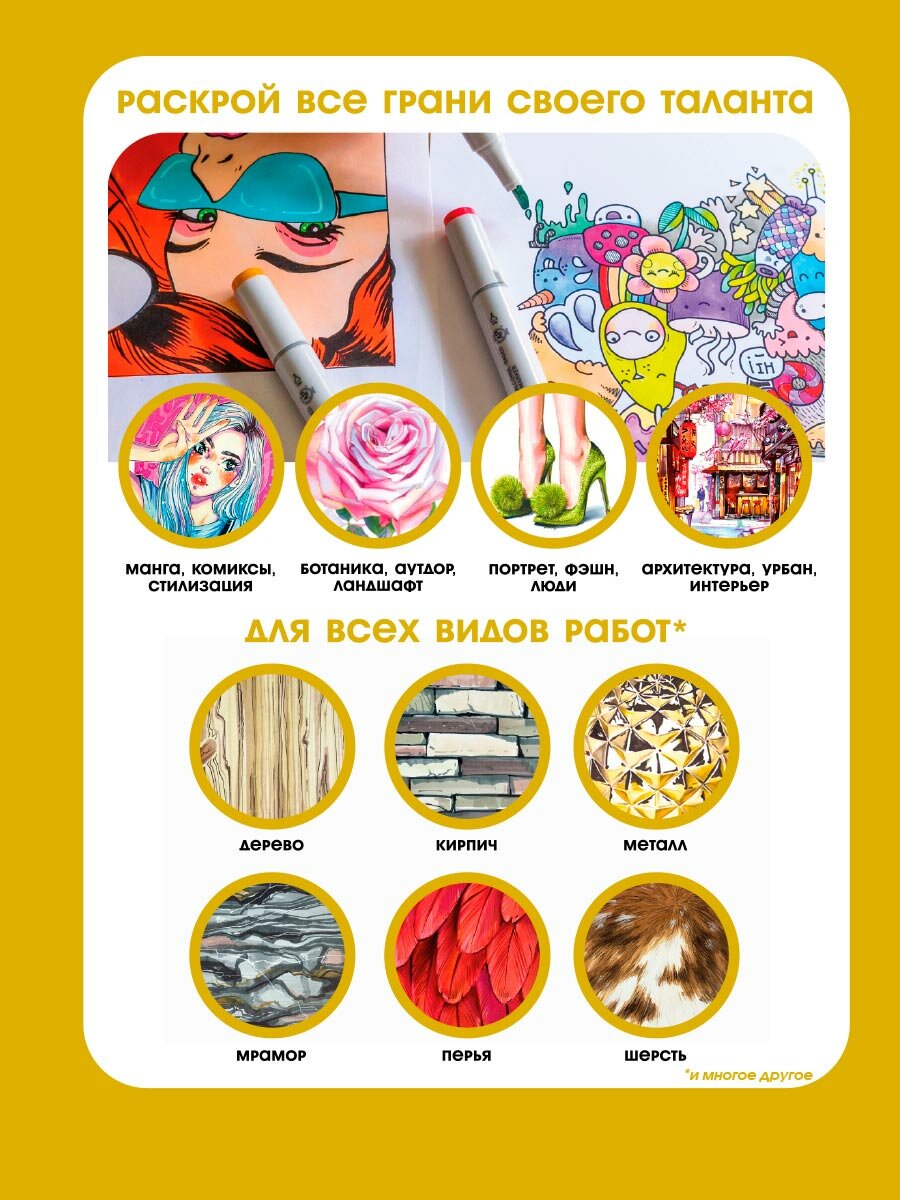Sketchmarker идеально подходят для всех видов творчества и художественных проектов, включая скетчинг, иллюстрацию, манга, комиксы, дизайн, граффити, хобби и другие.