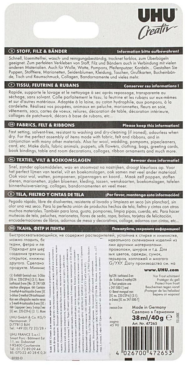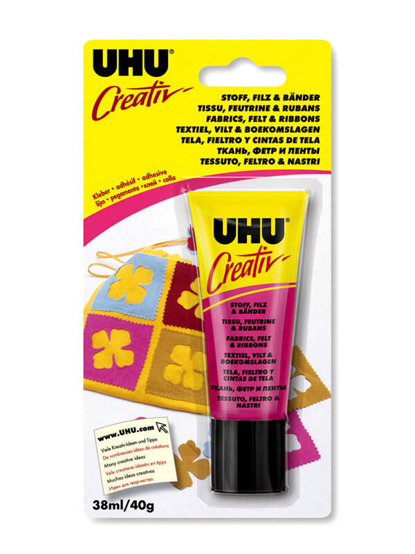 Клей UHU Creativ презназначен для склеиваниая тканей как между собой (фетр, атлас, шерсть, вата, хлопок и др.), так и в комбинации с другими материалами. Идеальный клей для изготовления кукол, тканевых коллажей, аппликаций, украшений, моделирования одежды. Не содержит растворителей. При высыхании становится прозрачным. Устойчив к растворителям: клеевой слой сохраняет прочность при стирке в любом температурном диапазоне от +30°С до+ 90 °С, а также при химчистке.