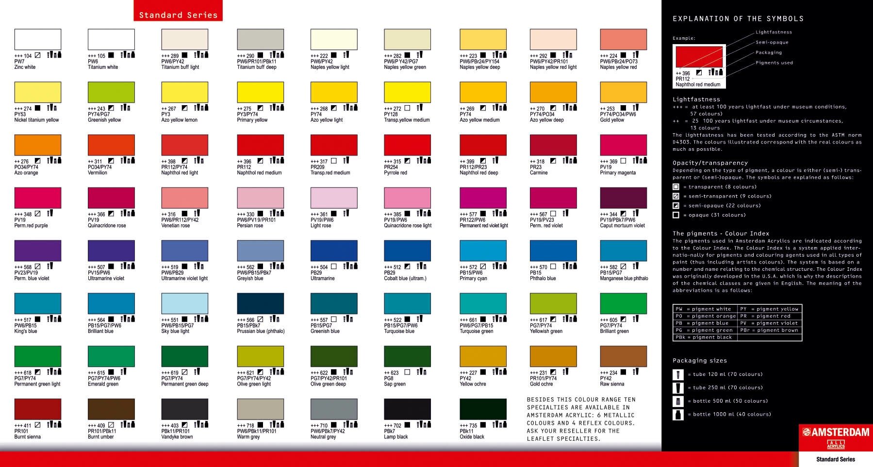 Акрил AMSTERDAM представлен широкой палитрой из 90 цветов, среди которых есть металлические и светоотражающие цвета. Выпускается поштучно в пластиковых тубах по 20 и 120 миллилитров, также в ассортименте присутствуют наборы различной комплектации.