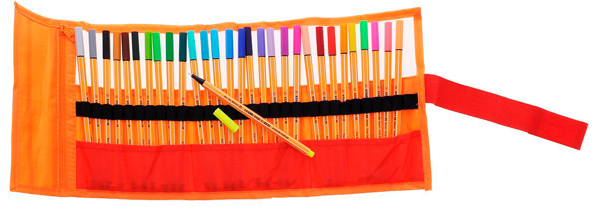 Капиллярная ручка идеально подходит для особо легкого и мягкого письма, рисования и черчения. Металлическое обжатие наконечника дает возможность работать с линейками и трафаретами. Высокое качество износостойкого пишущего наконечника и большой запас чернил значительно увеличивают срок службы ручки. Ручка долгое время сохраняет работоспособность без колпачка. Чернила на водной основе. Цвет колпачка соответствует цвету чернил. Толщина линии 0,4 мм. Набор из 30 разноцветных ручек в полосатом оранжево-белом, разворачивающемся чехле на липучке.