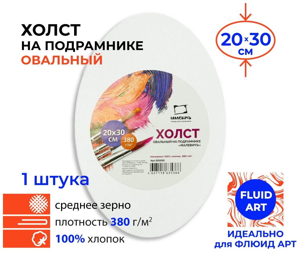 Холст на подрамнике грунтованный овальный Малевичъ 20х30 см 380 г хлопок (МЛ-202030)