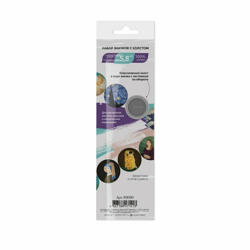 Значок с холстом от бренда "Малевичъ" — это оригинальная основа для творчества и уникальный подарок, который вы можете сделать своими руками. Лицевая часть значка выполнена из 100% хлопка, плотность холста 250 гр/м2. Холсты покрыты грунтом и готовы к работе акриловыми или масляными красками, акриловыми маркерами и сухими графическими материалами. После высыхания краски для максимальной сохранности работы рекомендуется покрыть бесцветным лаком. Обратная сторона значка оснащена классической застежкой в виде булавки.