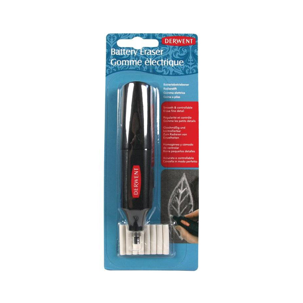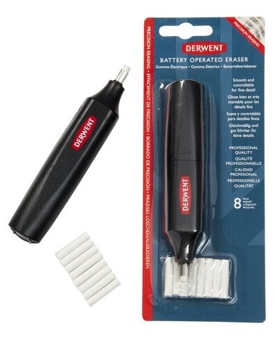 Электрический ластик Derwent — идеальный инструмент для точечной корректировки. Эргономичная ручка с кнопкой на корпусе позволяет удобно пользоваться ластиком как левой так и правой рукой. Мягкий каучуковый картридж легко сменить на новый, а быстрый мотор позволяет стирать снимать слой карандаша ровно там где вам нужно. Без каких-либо усилий вы можете подкорректировать чертеж, эскиз или скетч не причиняя вреда бумаге. Сменные картриджи изготовлены без содержания ПВХ и латекса. В комплекте электроластик и 8 сменных картриджей. Питание от двух батареек ААА (в комплект не входят).
