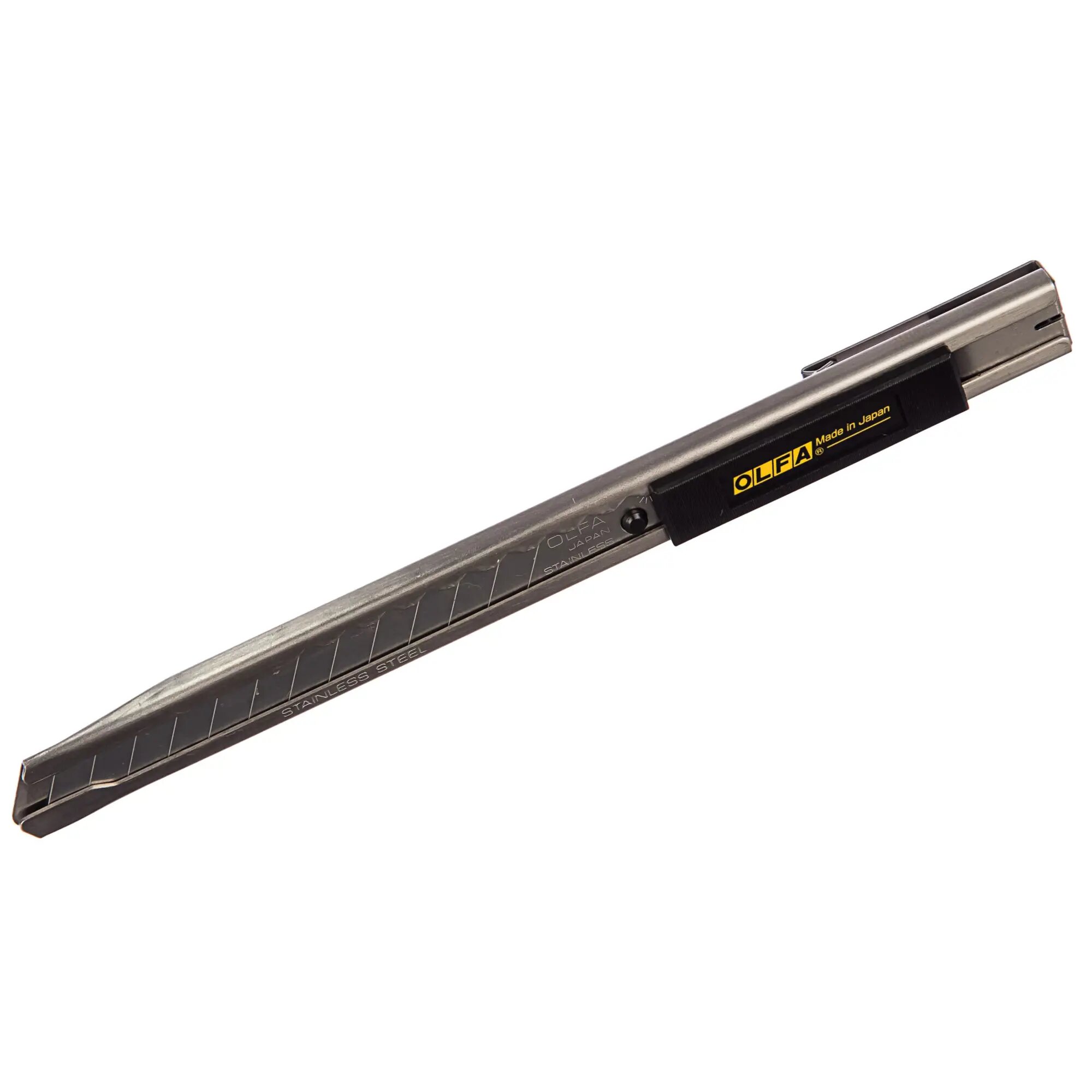 Нож в корпусе из нержавеющей стали отлично подходит для работ в агрессивной и влажной среде, где возможно возникновение коррозии. Нержавеющее стальное лезвие мягче, чем лезвие из углеродистой стали и не оставляет царапин при работе с обычным стеклом, сталинитом и триплексом. Корпус ультратонкого дизайна, совмещённый с направляющими, оснащён полуавтоматическим механизмом фиксации. Имеет съёмную клипсу для крепления на одежду, с прорезью для безопасного отламывания затупившихся сегментов лезвия. Подходит для работы как правой, так и левой рукой. Нож комплектуется сегментированным лезвием из нержавеющей стали серии AB длиной 80 мм (13 рабочих сегментов), шириной 9 мм.