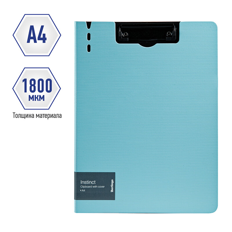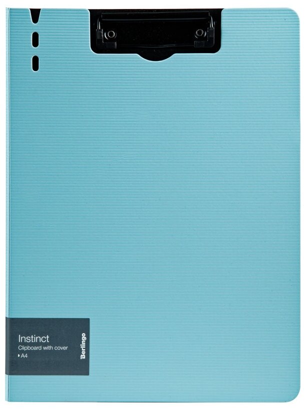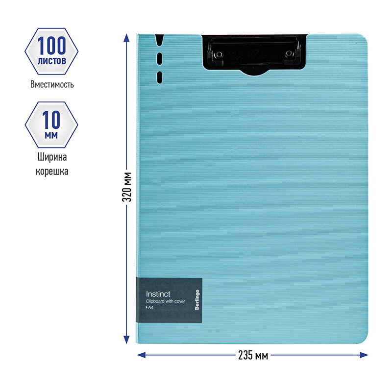Папка-планшет с зажимом Berlingo серии Instinct размером 320*225 мм изготовлена из плотного пластика (полифом) толщиной 1,8 мм. Вместимость папки – 100 листов, ширина корешка – 10 мм. Насыщенный пастельный голубой цвет внешней стороны в сочетании с фактурой "горизонтальные линии", черный цвет внутренней поверхности с прижимом. Металлический зажим для фиксации документов. Вырубки на крышке позволяют легко закрепить ручку на папке. Позволяет делать записи на весу.