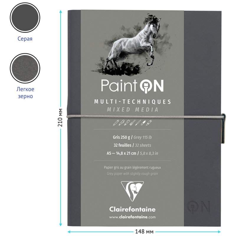 Скетчбук Clairefontaine для смешанных техник на сшивке Paint'ON — продукт для начинающих художников, городских скетчеров и дизайнеров. Скетчбук состоит из 32 листов и имеет блок плотностью 250 г/м2, тип скрепления – сшивка. Внутренний блок – бумага серого цвета с лёгким зерном. Компактный формат А5 позволяет взять скетчбук с собой и делать зарисовки на улице и в путешествии. Мягкая обложка из кожзама, фиксируется резинкой.