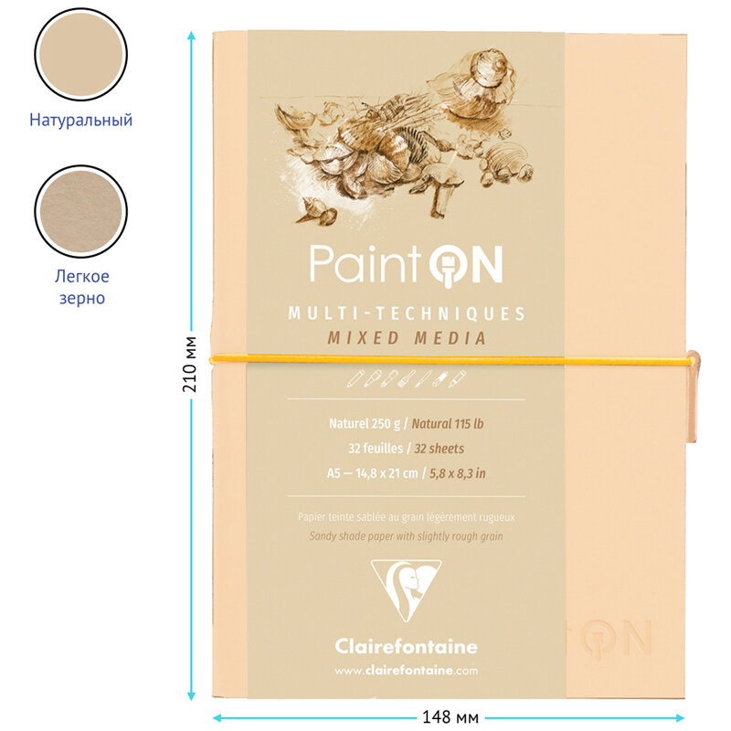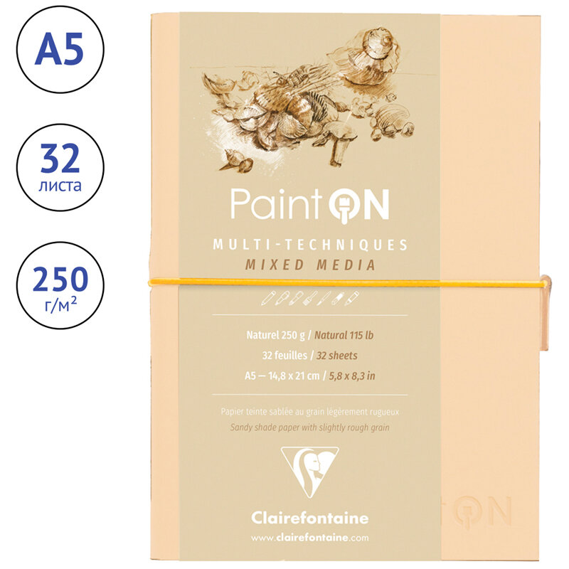 Скетчбук Clairefontaine для смешанных техник на сшивке Paint'ON — продукт для начинающих художников, городских скетчеров и дизайнеров. Скетчбук состоит из 32 листов и имеет блок плотностью 250 г/м2, тип скрепления – сшивка. Внутренний блок – бумага натурального цвета с лёгким зерном. Компактный формат А5 позволяет взять скетчбук с собой и делать зарисовки на улице и в путешествии. Мягкая обложка из кожзама, фиксируется резинкой.
