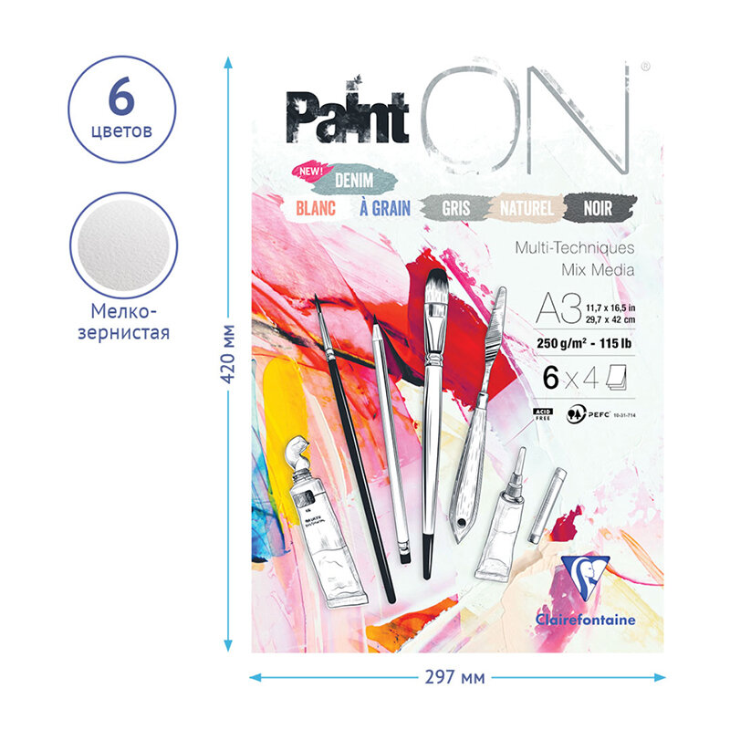 Альбом-склейка для смешанных техник Clairefontaine "Paint'ON" А3 24 л 250 г 6 цветов (975411C) (размер: 297x420)