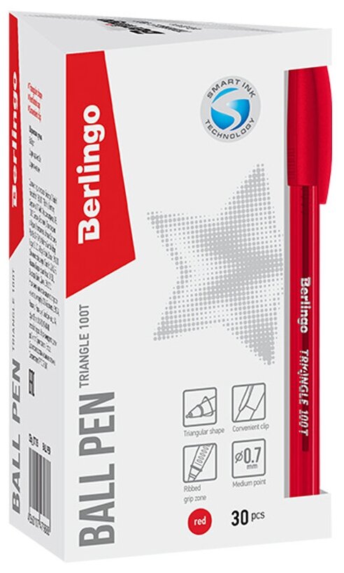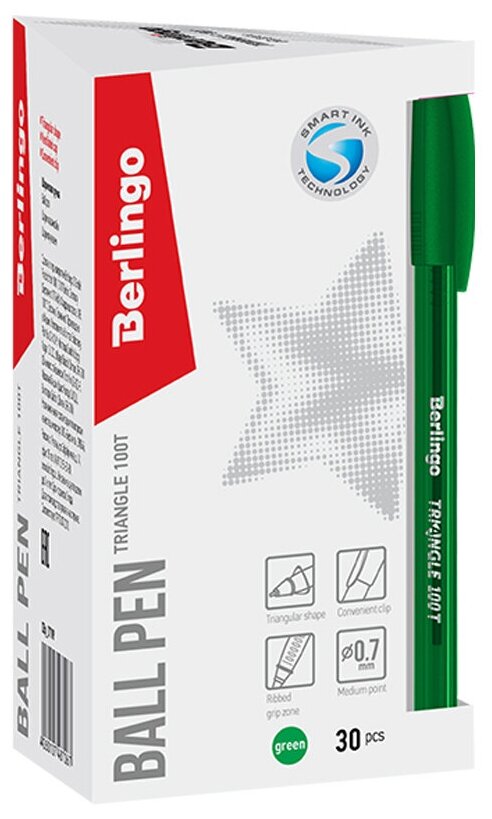 Одноразовая шариковая ручка Berlingo Triangle 100T с колпачком и пластиковым клипом будет надёжным помощником в учёбе или работе. Корпус ручки имеет эргономичную трёхгранную форму. Вентилируемый колпачок обеспечивает безопасность при использовании детьми. Рифление в зоне захвата позволяет удобно держать ручку и препятствует скольжению пальцев при письме. Цвет корпуса дублирует цвет чернил. Диаметр пишущего узла составляет 0,7 мм, благодаря чему ручка прекрасно подходит для любого стиля письма. Толщина линии письма составляет 0,5 мм, длина линии письма – 1000 метров.