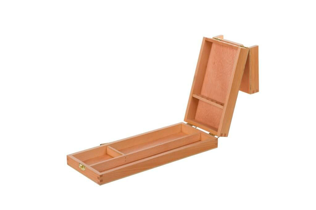 Данная модель оснащена 3-мя секциями для хранения художественных принадлежностей, а так же специальным отделением для хранения кистей на длинной ручке. Размер ящика 35х14х5,7 см., вес 0,59 кг.