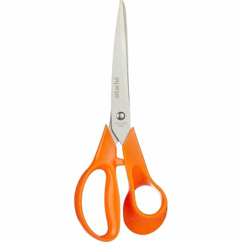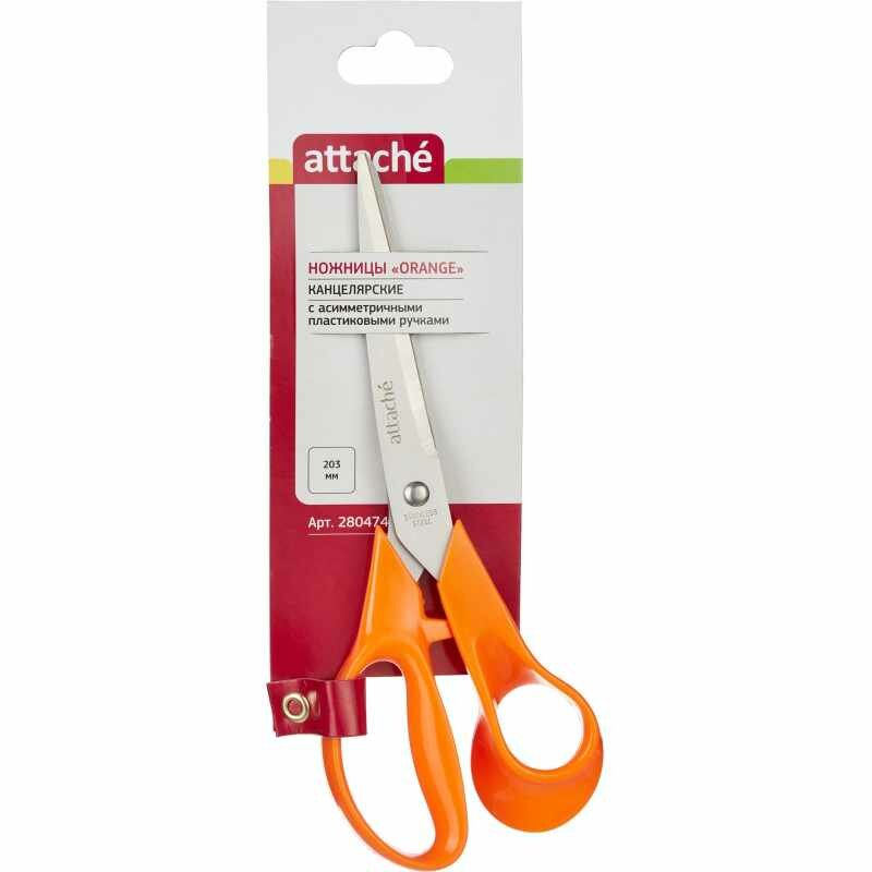 Канцелярские ножницы Attache с пластиковыми ручками и заостренными лезвиями, изготовленными из нержавеющей стали. Ручки ножниц выполнены в оранжевом цвете, удобная анатомическая форма обеспечивает естественное положение инструмента в руке. Трехсторонняя заточка лезвий. Ножницы имеют длину 20,3 см. Длина лезвий — 10,6 см.