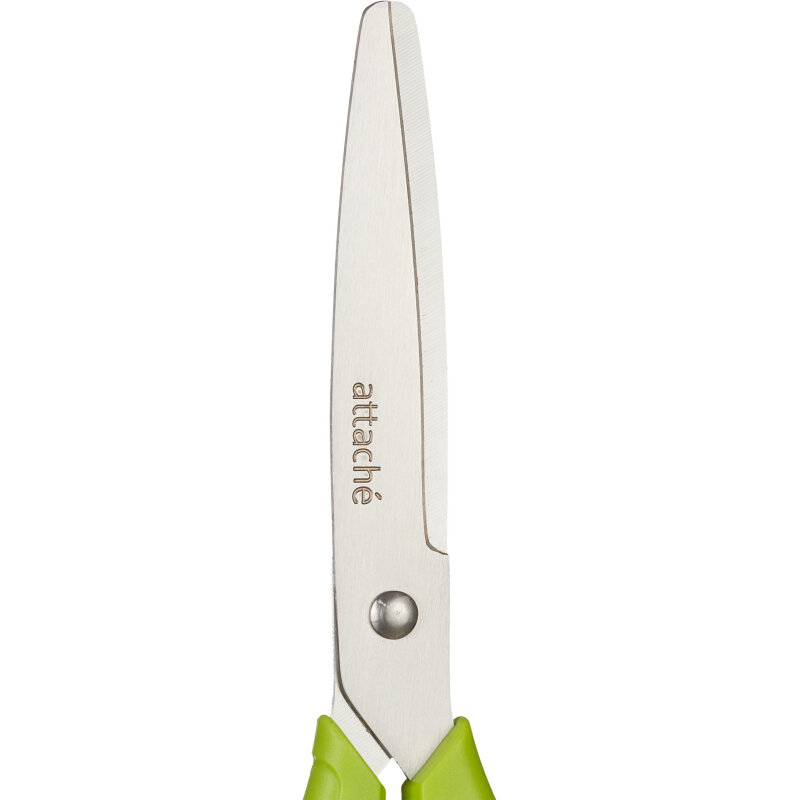 Канцелярские ножницы Attache с лезвиями, выполненными из нержавеющей стали. Ручки яркого салатового цвета изготовлены из пластика и имеют анатомическую форму для естественного положения ножниц в руке. Двухсторонняя заточка лезвий. Изогнутые лезвия облегчают работу с ножницами и обеспечивают плавный и мягкий ход. Длина ножниц — 20 см.