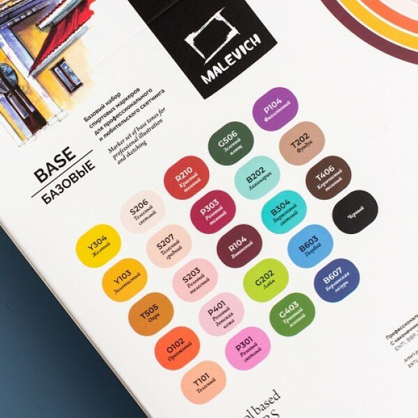 Художественные маркеры "Малевичъ" GrafArt Brush содержат чернила на спиртовой основе. Формула чернил, изготовленных в Великобритании, обеспечивает создание плавного градиента и отсутствие выраженных полос. Маркеры двусторонние: с одной стороны маркера классическое скошенное долото, с другой — экстра мягкая кисть (произведенная в Японии), которая позволяет работать маркером в живописной технике, создавая легкие воздушные мазки, растушевки и тонкие линии. Овальный корпус выполнен из пластика. Его удобно держать в руках, а благодаря форме, он не перекататывается по столу, сохраняя порядок на рабочем месте.