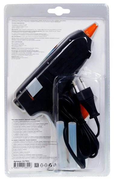 Пистолет клеевой 40 Вт большой (в блистере) предназначен для прочной фиксации поверхностей с помощью расплавленной клеевой массы. Заправляется он специальным клеевым стержнем диаметром 11 мм. Корпус клеевого пистолета изготовлен из ударопрочной пластмассы и имеет скобу для надежной установки в нерабочем положении. Размер пистолета - 16х14 см. Принцип работы: клеевый стержень плавится в металлической камере с помощью нагревательного устройства и для точного дозирования при нажатии на курок подаётся из сопла на склеиваемую поверхность. Мощность пистолета в 40 Вт позволяет очень быстро разогреть клеевой стержень и получать удовольствие от быстрой и бесперебойной работы. С его помощью вы сможете склеить: дерево, пластик, резину, кожу, стекло, металлы (их лучше перед работой разогревать феном), ткань, пенопласт, керамику, картон, бумагу, цветы или что-то другое. Используется как в домашних условиях, так и на производстве: для монтажа электрических плат, декорирования, изготовления упаковочной и сувенирной продукции, при прокладке кабеля сетей фиксированной телефонной связи и сетей передачи данных, при производстве багетов и картинных рам.