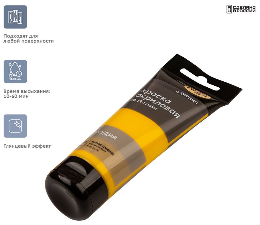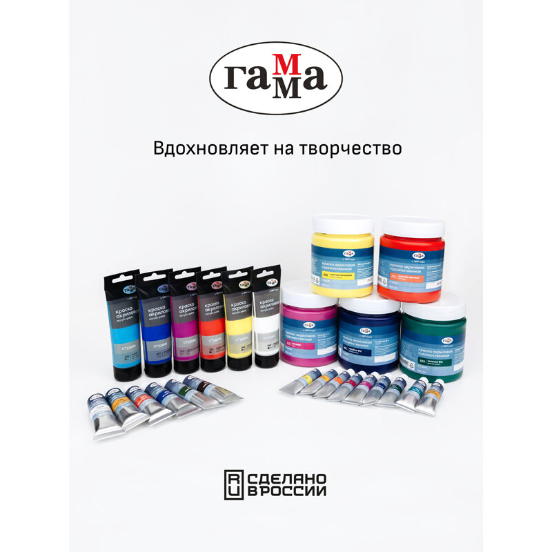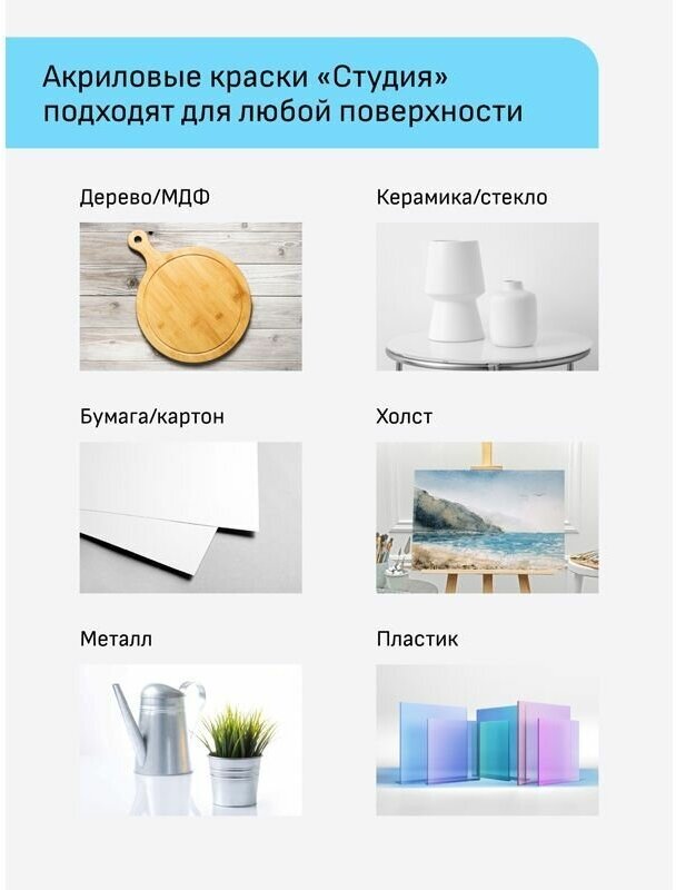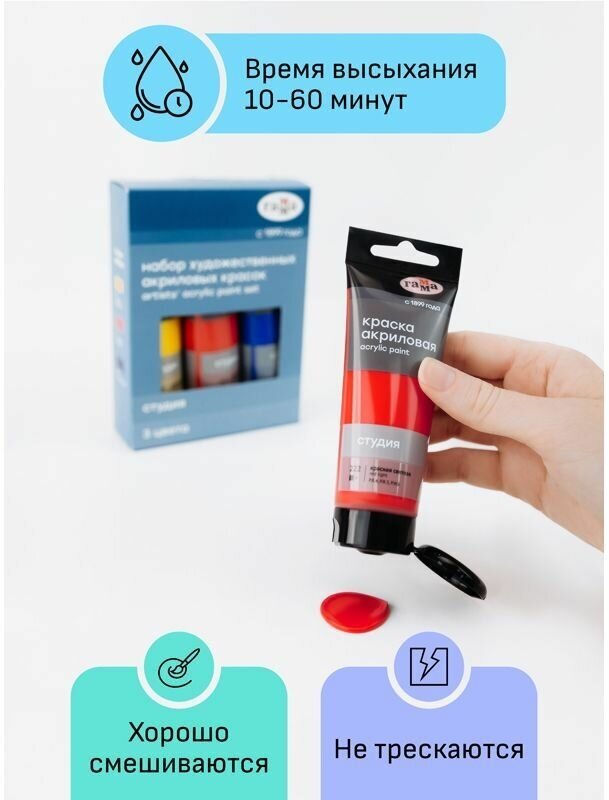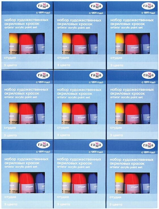 Наборы новых акриловых красок "Студия" предназначены для художественно-живописных и декоративно-прикладных работ. В наборах собраны основные цвета. Акриловые краски «Студия» отличают насыщенные цвета, высокая адгезия, отличная прочность. После высыхания становятся глянцевыми, практически не темнеют, специальные добавки позволяют максимально раскрыть красоту цвета. Краски обладают густой консистенцией, высокой разносимостью, позволяя писать в различных техниках живописи. Время высыхания от 10 минут до 1 часа в зависимости от толщины слоя краски. Подходят для бумаги, картона, грунтованного холста, дерева, стекла, кожи, ткани. Прозрачный корпус тубы позволяют увидеть цвет краски, а удобная крышка флип-топ предотвращает высыхание краски в тубе.