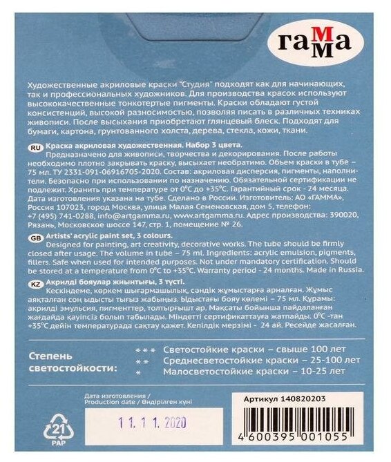 Набор акрила Гамма "Студия" 3 цв*75 мл (ГМ-140820203)