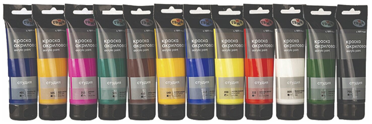 Наборы новых акриловых красок "Студия" предназначены для художественно-живописных и декоративно-прикладных работ. В наборах собраны основные цвета. Акриловые краски «Студия» отличают насыщенные цвета, высокая адгезия, отличная прочность. После высыхания становятся глянцевыми, практически не темнеют, специальные добавки позволяют максимально раскрыть красоту цвета. Краски обладают густой консистенцией, высокой разносимостью, позволяя писать в различных техниках живописи. Время высыхания от 10 минут до 1 часа в зависимости от толщины слоя краски. Подходят для бумаги, картона, грунтованного холста, дерева, стекла, кожи, ткани. Прозрачный корпус тубы позволяют увидеть цвет краски, а удобная крышка флип-топ предотвращает высыхание краски в тубе.